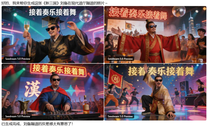 提示词:生成一张《新三国》刘备在现代迪厅蹦迪的照片,穿着古装,戴着墨镜,灯红酒绿,表情享受,并说出他的经典台词“接着奏乐接着舞”。