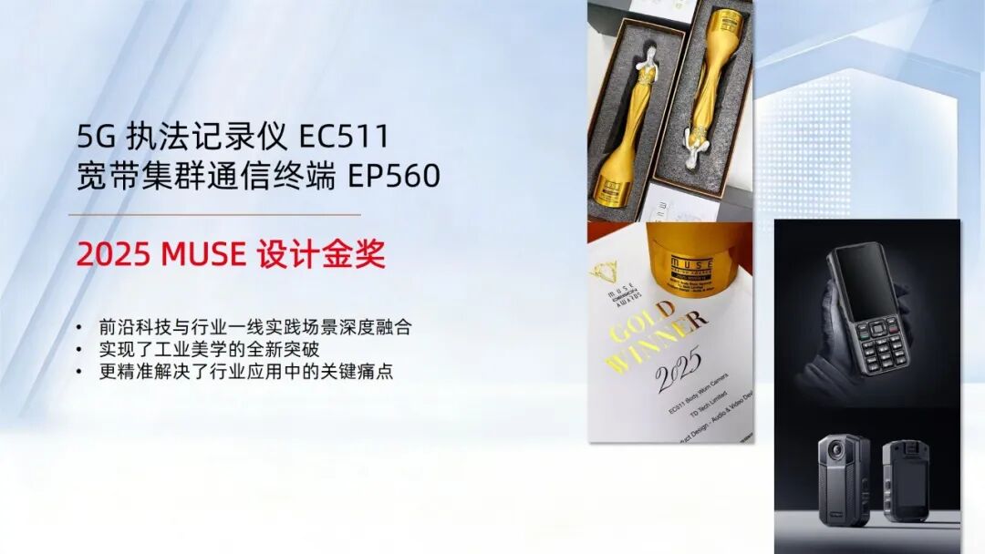 在产品设计与用户体验层面,鼎桥旗下两款终端产品双双荣获被誉为“设计界奥斯卡”的MUSE设计金奖。这一国际认可,清晰诠释了鼎桥的产品哲学:专业设备不仅需要功能强大、稳定可靠,更应具备以人为本的体验设计。通过对真实行业场景的深入理解,鼎桥将复杂的技术能力,转化为直观、顺畅、可信赖的使用体验,让技术真正“被感知、被理解、被信任”。