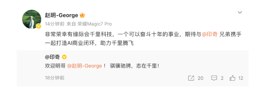 凤凰网科技讯 2月12日,前荣耀终端股份有限公司CEO赵明转发千里科技董事长、阶跃星辰董事长印奇博文,并官宣入职千里科技。