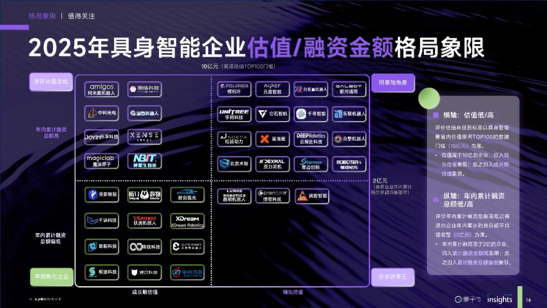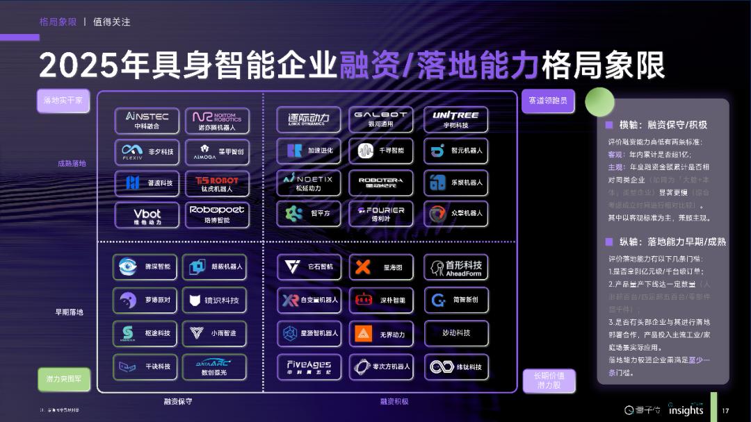 量子位智库分别基于估值/融资金额维度、融资能力/落地能力维度,划分具身智能行业格局象限。