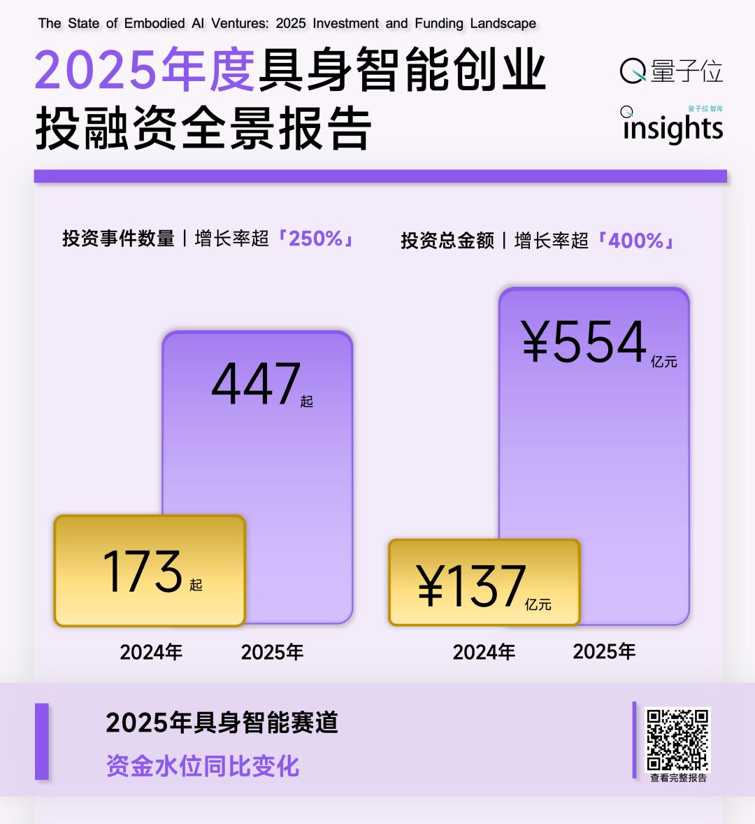 2025年,具身智能赛道的全年投资事件从2024年的173起暴涨至447起,涌入资本总量从137亿飙升至554亿,增长分别超250%和400%。