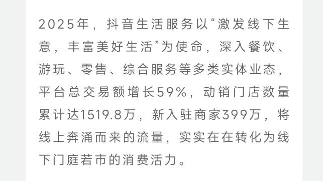 去年12月,抖音官方发了一份《2025抖音生活服务这一年》。数据显示,2025年一整年,抖音平台总交易额增长59%,动销门店数量累计达1519.8万,新入驻商家达到399万。