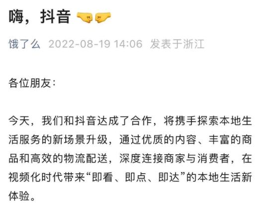 2022年8月,抖音正式与饿了么(现改名淘宝闪购)达成合作,通过小程序试点“外卖到家”服务,直冲美团腹地。