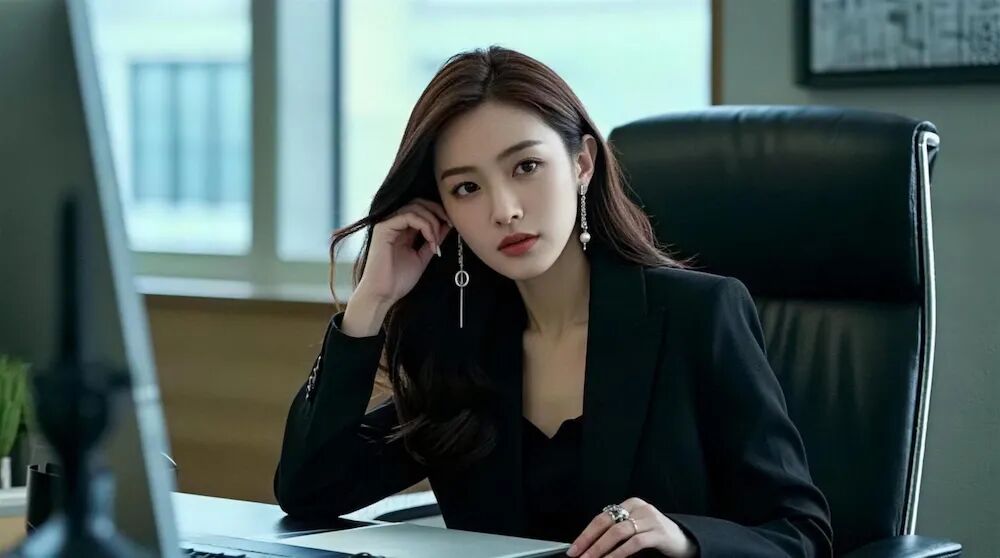 提示词:现代高层办公室,冷灰色调搭配落地窗的自然光线。女主穿着黑色西装,手肘撑在办公桌托腮凝视镜头,眼神冷静且有力量。镜头从正面镜头,切换到侧面镜头,捕捉她手指轻敲桌面的细节,她皱起眉头,有点生气,中文开口说道:“这就是这个星期的成果么?我不满意,重新做吧。”背景加入键盘敲击声与窗外城市车流的环境音,营造专业且略带压迫感的职场氛围,无背景音乐。