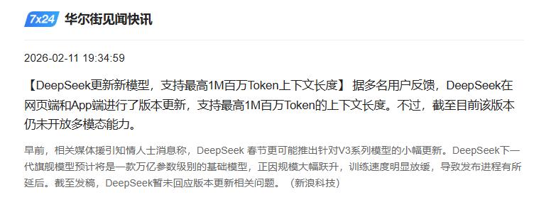 DeepSeek则被曝V4版本锁定2月中旬,重点改进编码和超长提示词处理。11日有报道称,DeepSeek更新新模型,支持最高1M百万Token。