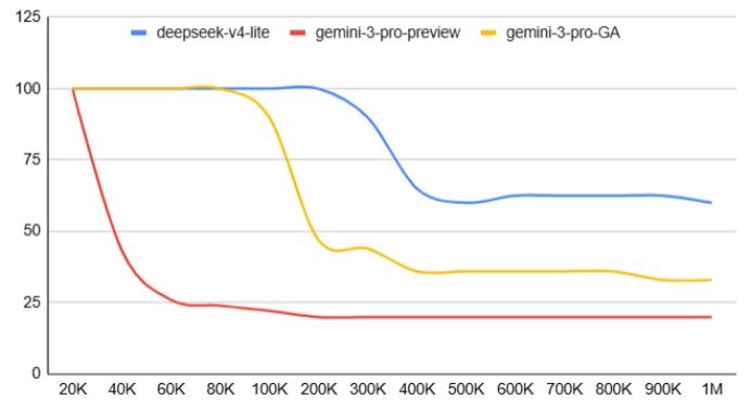 根据技术社区的测试结果,DeepSeek的新模型在100万token长度下仍然能够保持60%以上的准确率,准确率曲线在20万token以内近乎水平,此后才开始出现较为平缓的衰减,优于同期测试的Gemini系列模型。