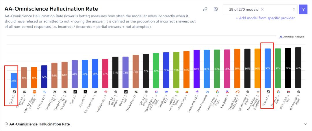 更关键的技术突破在于可靠性指标的飞跃:在AA-Omniscience幻觉率测试中,GLM-5将幻觉率从前代版本GLM-4.7的90%直接压缩至34%,打破Claude 4.5 Sonnet的纪录成功登顶。