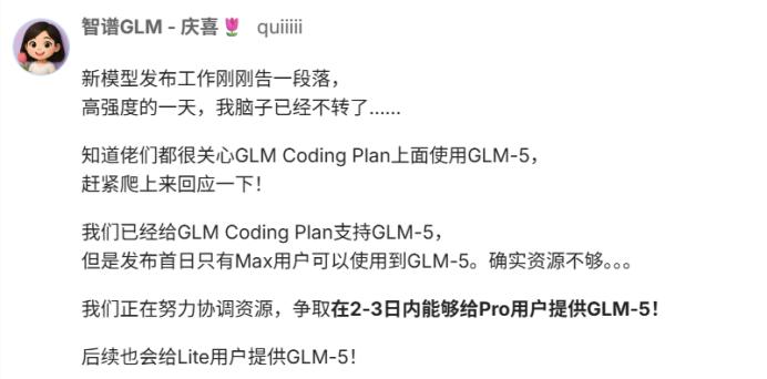 智谱在收到大量针对该问题的反馈后,工作人员迅速在技术社区和平台回复,坦承算力资源极为紧张,“并发不足已持续1个月”、“限购20天仍无法满足需求”等问题尚未解决。Pro套餐用户在未来2-3日内即可使用GLM-5,Lite套餐用户仍无明确期限。