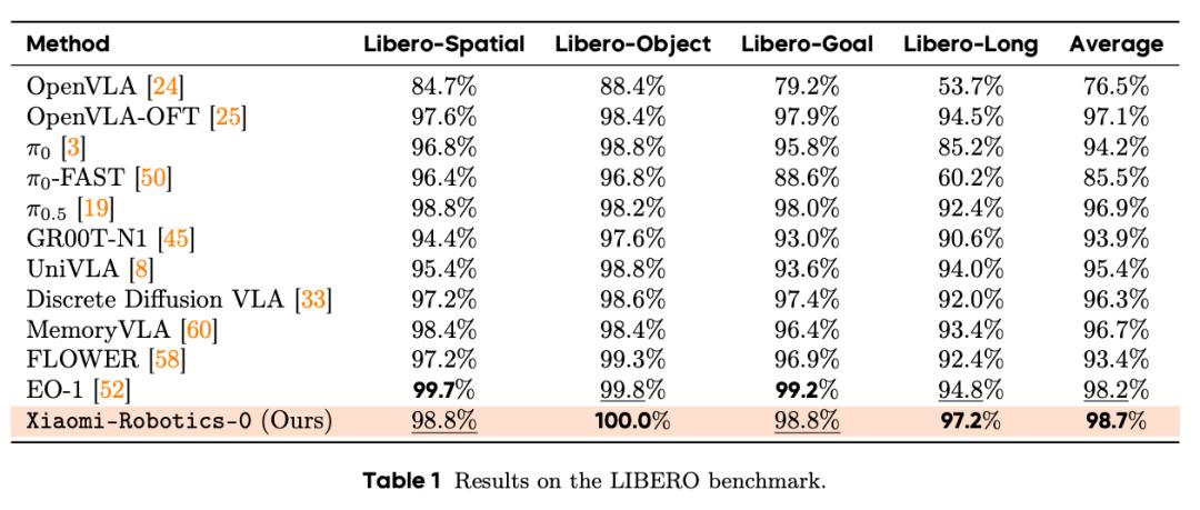 尤其是在Libero-Object任务上,Xiaomi-Robotics-0达到了100%成功率,并以98.7%的平均成绩位列Libero测试机前列。
