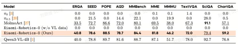 接着来看Xiaomi-Robotics-0在MathVista、ScienceQA等针对视觉理解和数学推理的VLM benchmark中的表现。