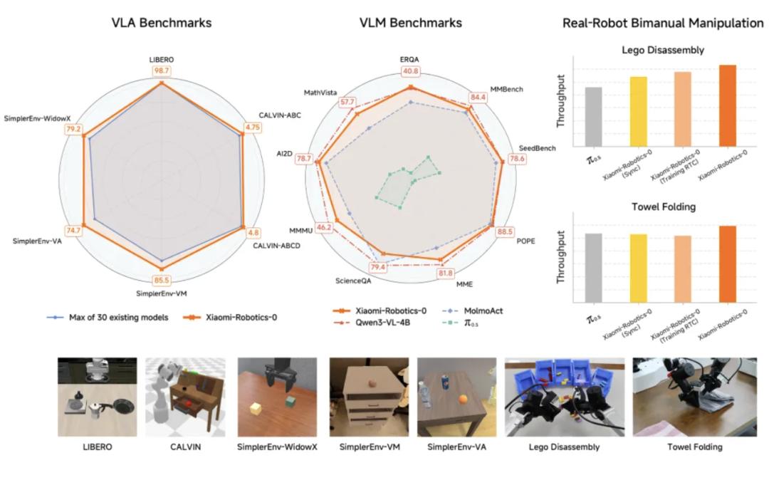 在三重技术创新的加持下,Xiaomi-Robotics-0展现出了极为硬核的测评结果。