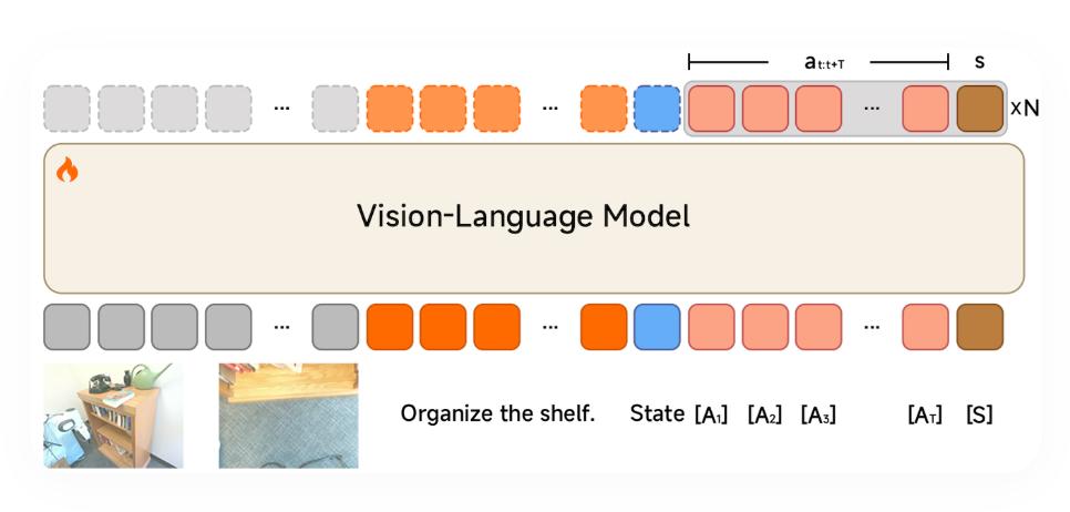 由于DiT与底层VLM同为Transformer结构,可以直接复用VLM的KV Cache,减少重复计算。