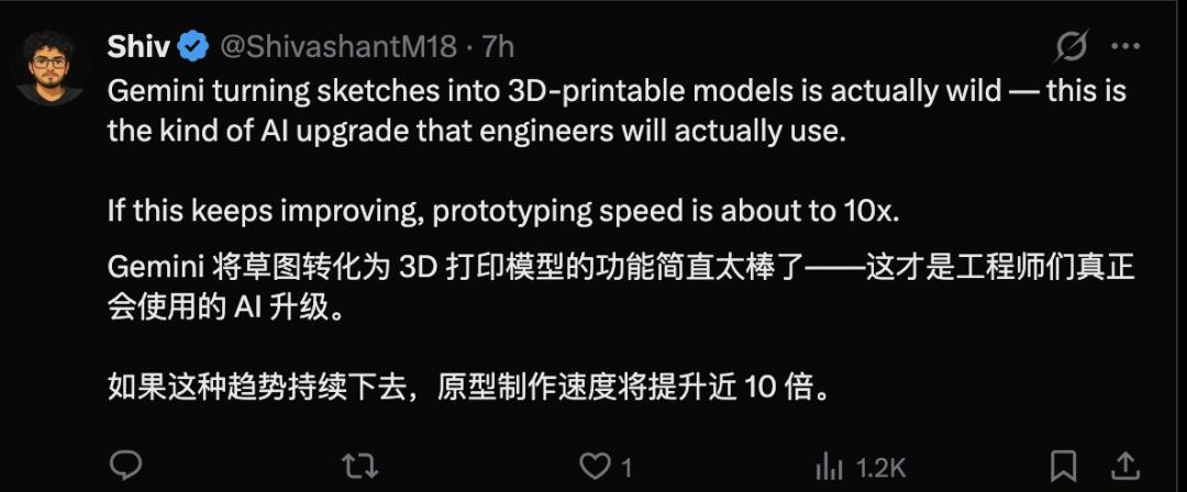 还有 x 用户认为这是一次重要的升级,他表示:“Gemini 将草图转化为 3D 打印模型的功能简直太棒了——这才是工程师们真正会使用的 AI 升级。如果这种趋势持续下去,原型制作速度将提升近 10 倍。”