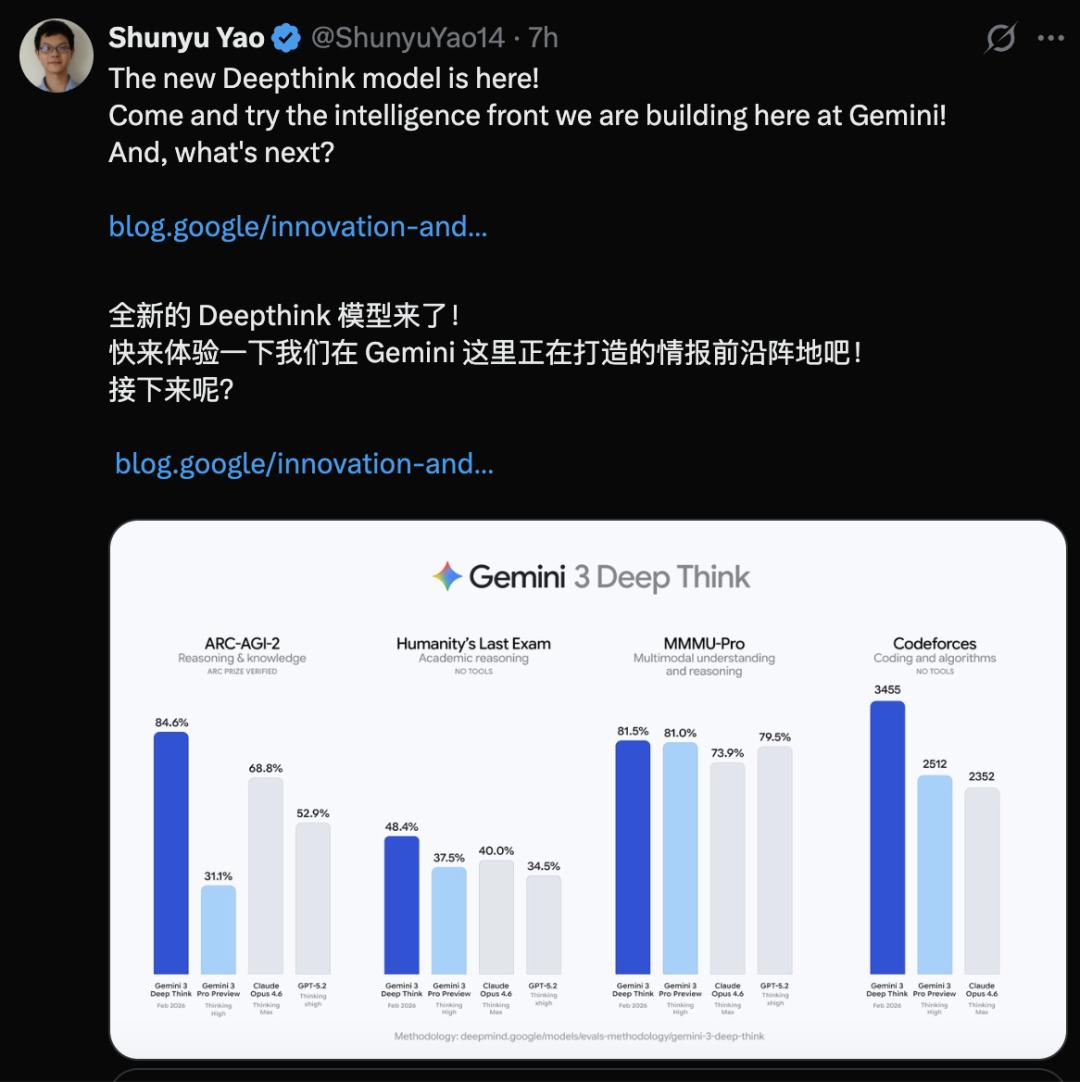 值得注意的是,去年 9 月加盟谷歌 DeepMind 的清华物理系知名研究者姚顺宇(Shunyu Yao),同样是 Deep Think 新模型的核心参与者之一。