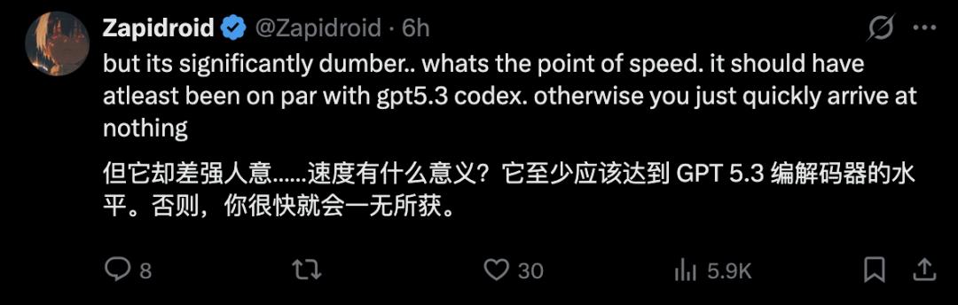 多位用户表达了类似的观点,认为只速度快有什么意义?它至少应该达到 GPT 5.3 编解码器的水平。“否则,你很快就会一无所获”。