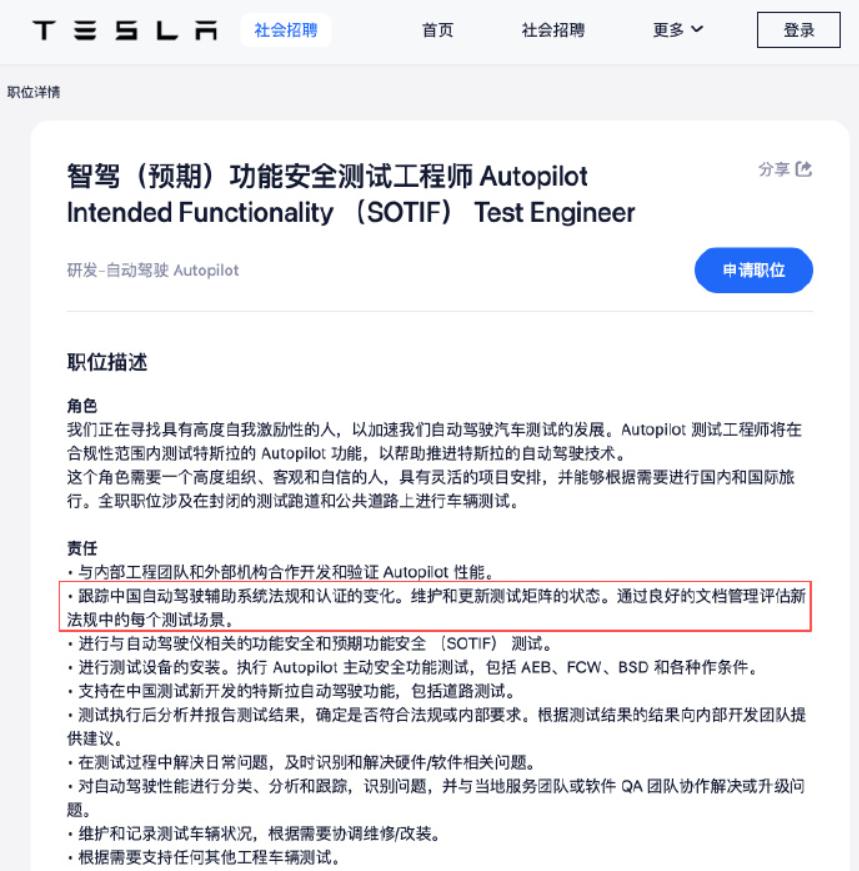 去年11月,特斯拉上海曾招聘过“智驾功能安全测试师”岗位,需要合作开发和验证Autopilot性能,也要求了跟踪国内自动驾驶辅助系统法规和认证的变化等。