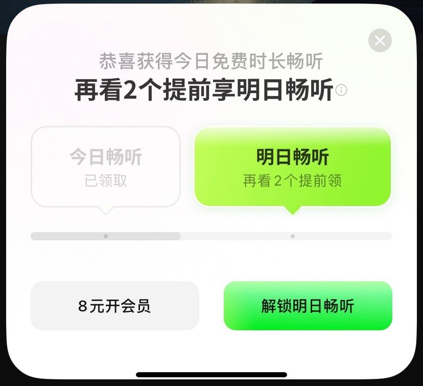 与番茄小说、红果短剧的切入路径类似,汽水音乐沿用了一套基于用户时长变现的会员兑换体系,用户首次登录即可领取免费会员,无需任何付费,后续可通过每观看80秒广告,兑换24小时会员权益,且可以累加。