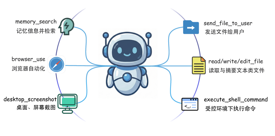 AgentScope 为 CoPaw 读写文件、运行 shell 命令、操作浏览器等提供支持;ReMe 提供记忆系统,支持跨回合经验沉淀与检索、以及文档 / 工作区记忆(MEMORY.md、每日笔记等),保证对话连贯、行为可控、可追溯。