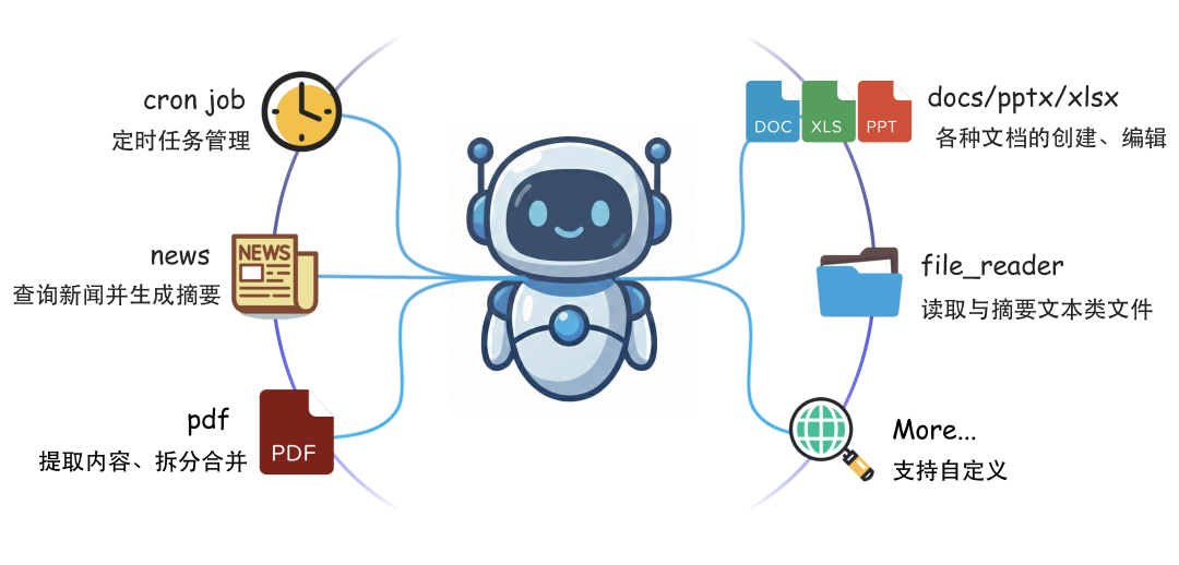 CoPaw 通过 Skills 扩展 Agent 的能力:内置多类开箱即用能力(cron、file_reader、pdf、docx、pptx、xlsx、news 等),支持在工作目录下添加自定义 Skill,或通过控制台进行 Skill 的启用 / 禁用、编辑等操作。