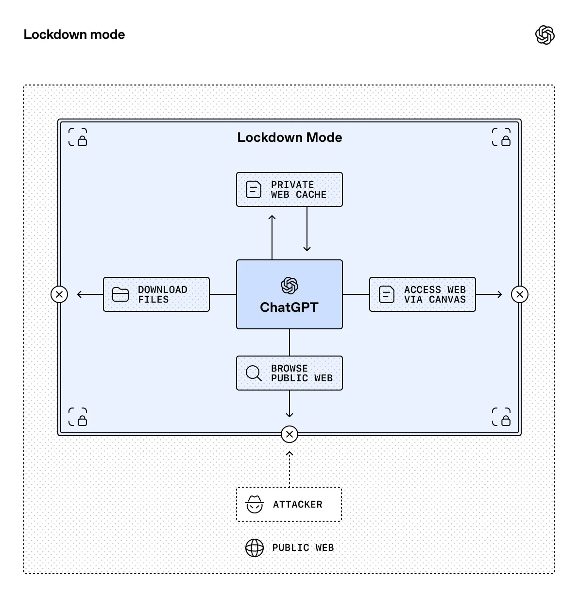 其一是 ChatGPT 的“Lockdown Mode(锁定模式)”,这是一项面向高风险用户的可选高级安全设置;