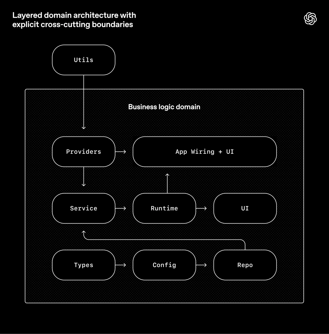 OpenAI围绕一个严格的架构模型构建系统。每个业务领域都有固定层级,并且依赖方向被严格验证,只允许有限的合法边界。