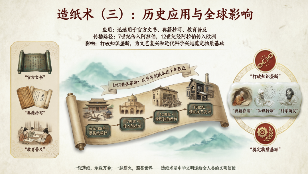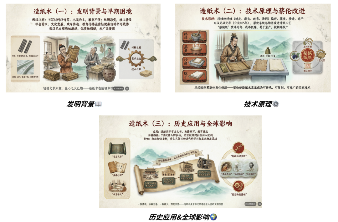 但其实最让我意外的是「生图」,在提示词几乎没给细节的前提下,AI主动生成了信息图漫画,把造纸术的历史演进过程画成手绘时间线,这波确实有点超出我预期。