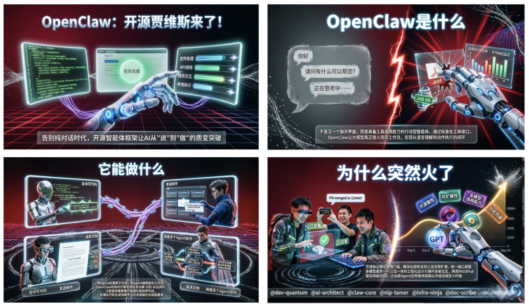 最近科技圈最火的无疑是OpenClaw,我直接让AI做个科普漫画PPT,赛博感超强,一下就有硅基入侵内味儿了!
