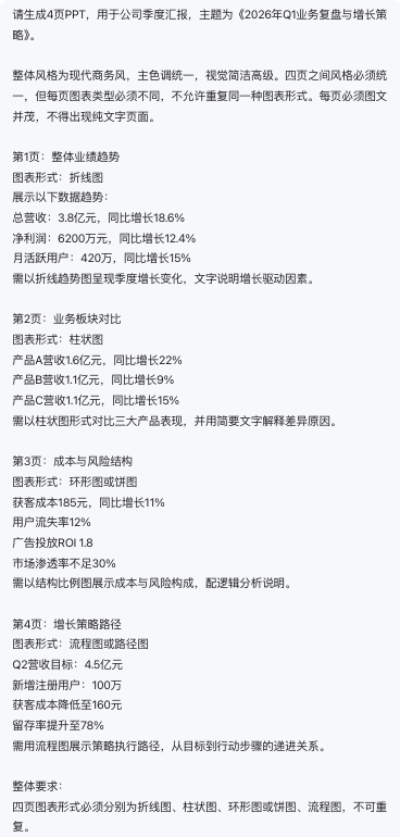 PPT毕竟是排版+文字+图形的综合活儿,AI在输出这类内容形式时,在字体边缘、图表细节、转角处理这些偏图形的维度上,偶尔还是会有些小瑕疵。