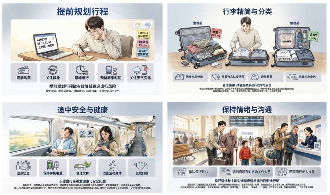 咱再来应应景,让AI做一份春运行程注意事项PPT,别说这手绘风格还真有一套,回家过年氛围感直接拉满: