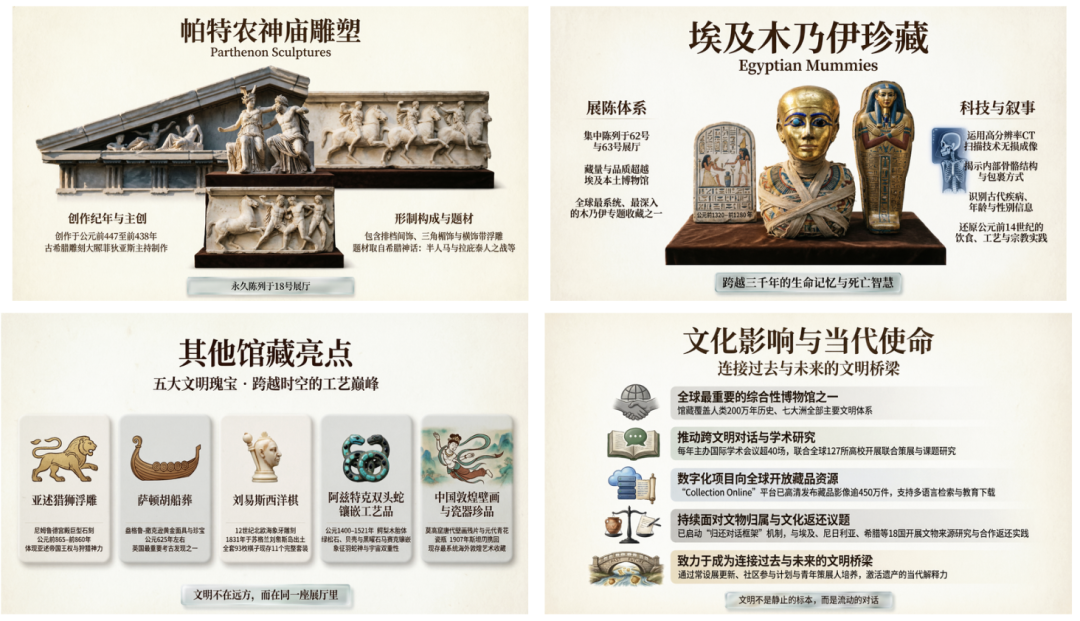 再来看这个大英博物馆展馆介绍,从帕特农神庙雕塑到木乃伊都用真实图片铺陈,历史质感也能稳稳拿住,666~