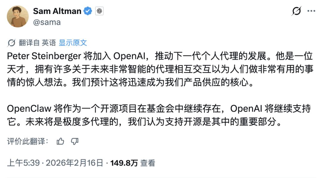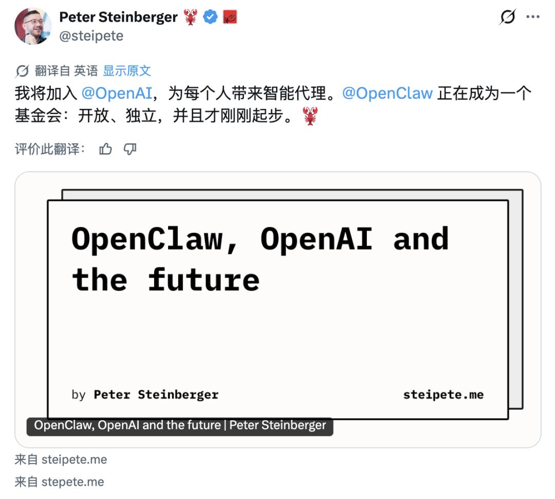 用他自己的话说:「我将加入 OpenAI,致力于把智能体带给每一个人。OpenClaw 将转为基金会形式运作,并保持开源和独立。」