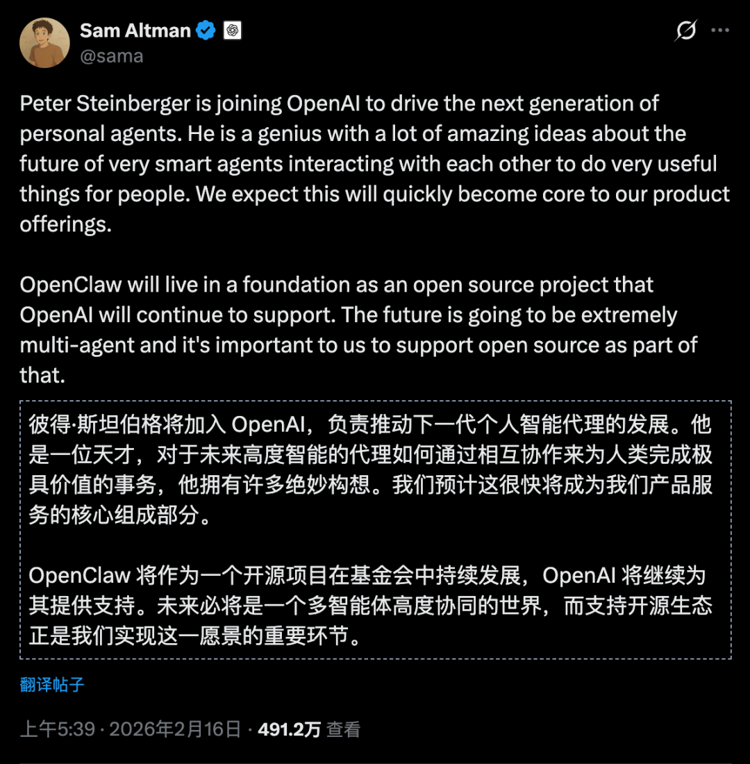 对我来说,OpenClaw 保持开源并自由发展一直很重要。最终,我觉得 OpenAI 是继续推进我这一愿景、扩大其影响力的最佳归宿。与那里的人聊得越多,我就越清楚地看到:我们有着相同的愿景。