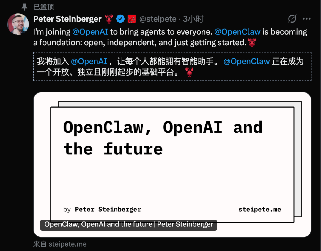 Peter Steinberger直接以「OpenClaw、OpenAI 与未来」来展望。