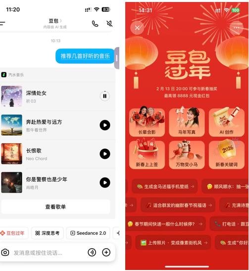 在产品端,用户通过“豆包过年”专区体验穿搭指导、新春文案生成、AI长辈合影等功能,即可参与抽奖,最高可领取8888元现金红包。