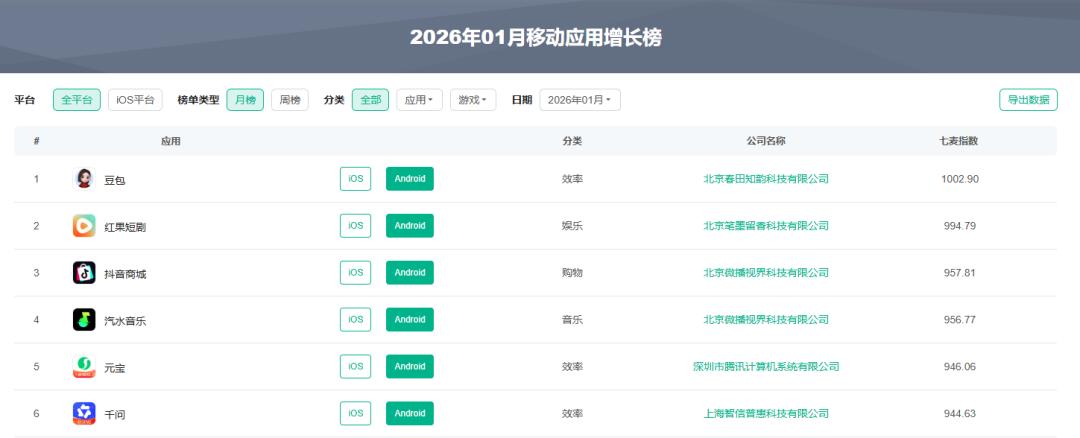 始于2014年的春节红包营销,之所以历经多年仍被大厂沿用,除契合春节消费场景外,其强用户感知、高社交裂变的属性,使其成为当前AI行业高获客成本背景下的最优拉新路径之一。例如,豆包、元宝、千问在2026年1月移动应用增长榜中,分别位列TOP1、TOP5、TOP6。