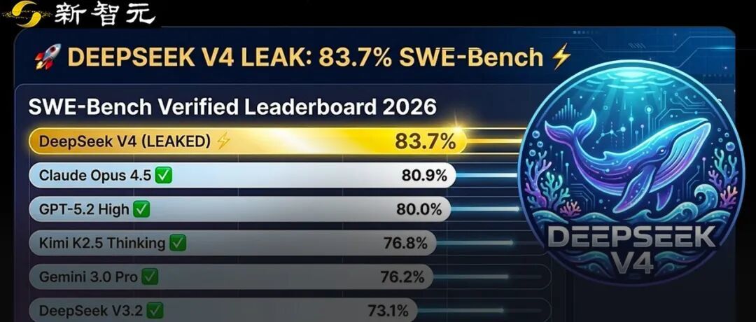 【新智元导读】DeepSeek V4,据说明天就要上线了?这是首个匹敌顶尖闭源模型的开源模型,被网友评为「一鲸落万物生」。泄露的基准测试显示,它在SWE-bench Verified上取得了83.7%,已经超越Opus 4.5和GPT-5.2!