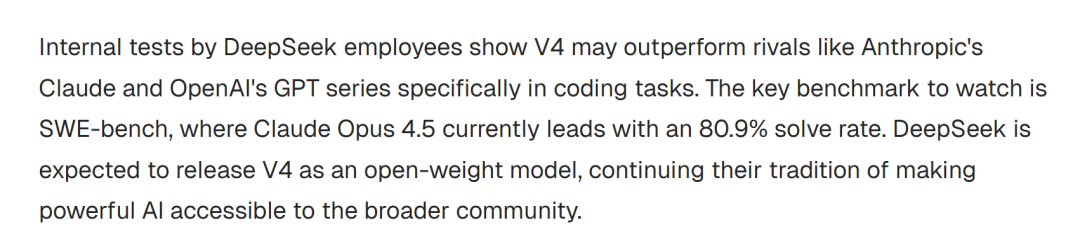 DeepSeek员工的内部测试显示,V4 在编码任务方面可能超越Anthropic的Claude和 OpenAI的GPT系列。关键的基准是SWE-bench,Claude Opus 4.5目前以80.9%的得分领先。