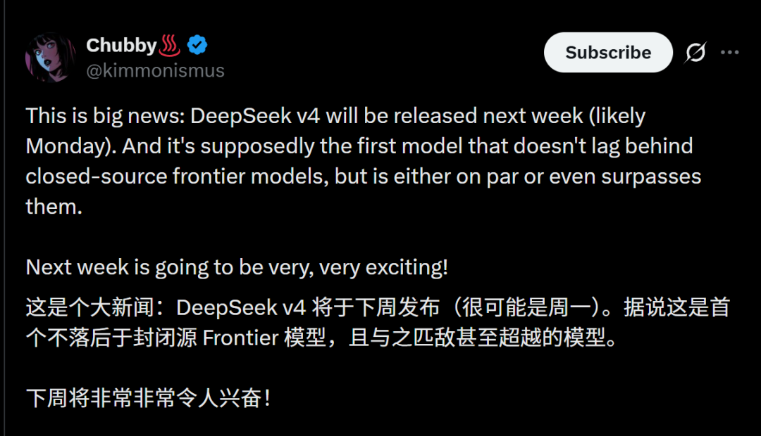 总之,DeepSeek V4的发布时间,很可能是周一。据说,这是首个不落后于闭源顶尖模型,甚至能与之匹敌甚至超越的模型。