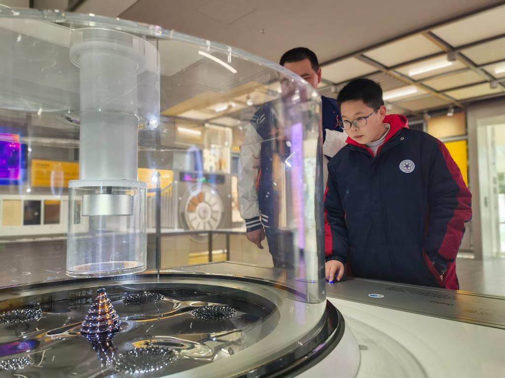 2月17日,观众在上海科技馆“材料魔方”展区体验互动展项“磁流体芭蕾”。新华社记者 陈爱平 摄