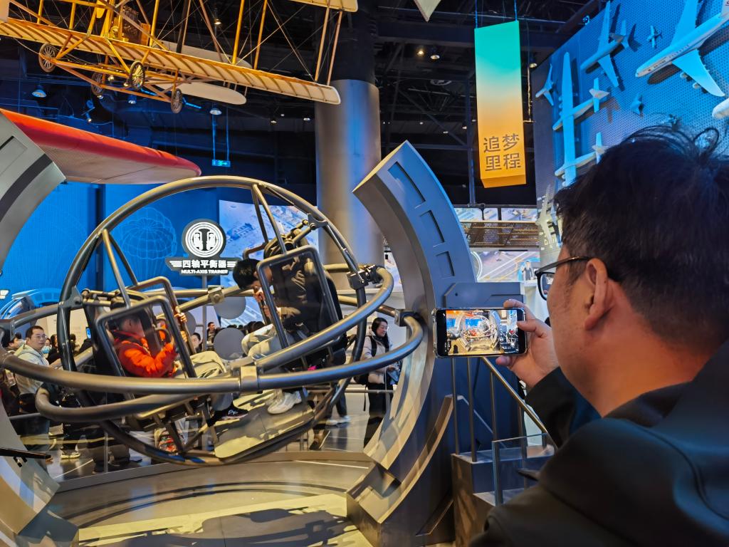 2月17日,观众在上海科技馆“飞行探秘”展区排队体验“四轴平衡器”。新华社记者 陈爱平 摄