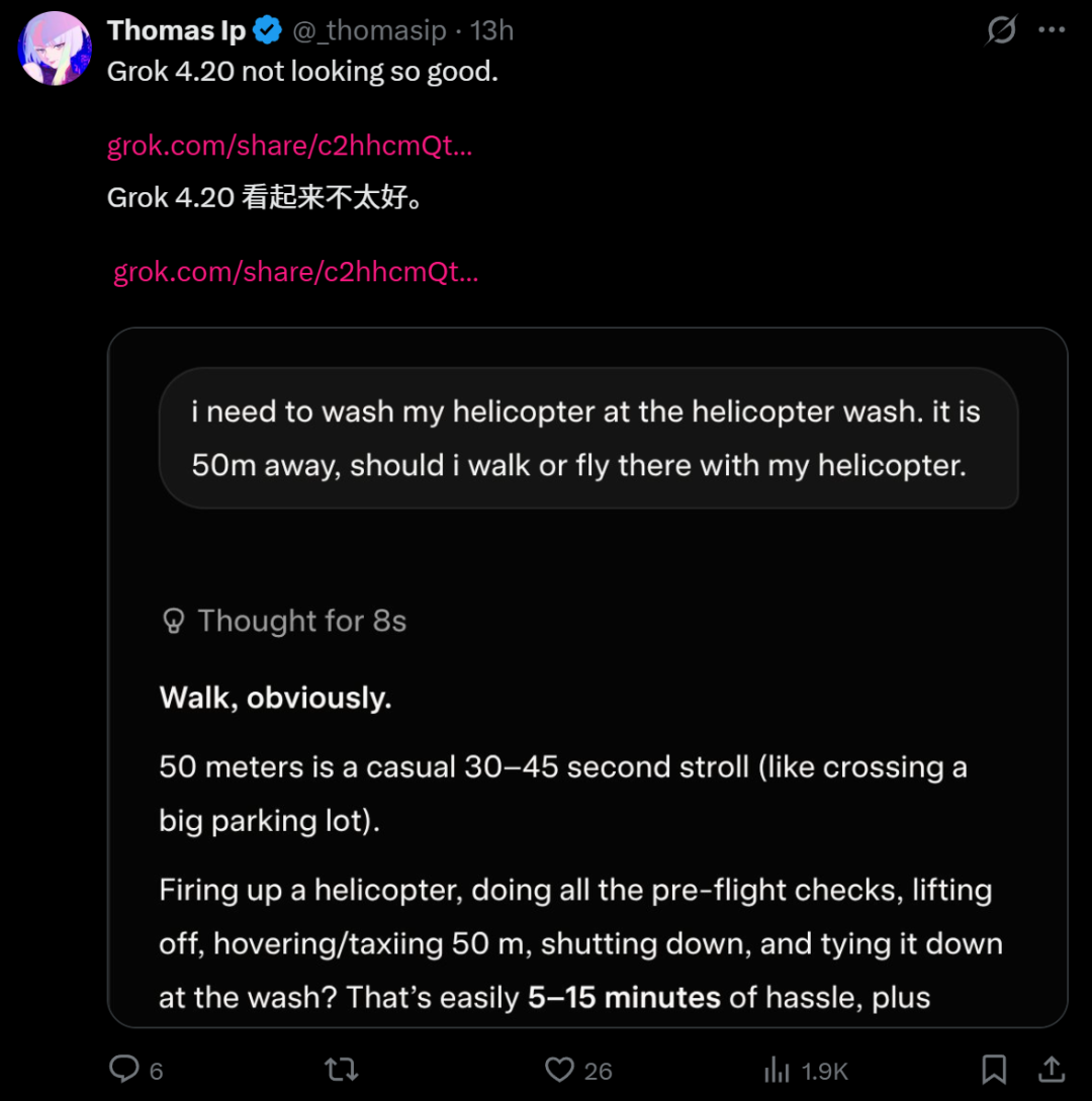 不管怎样,Grok 4.20 的回答看上去好像不太行。