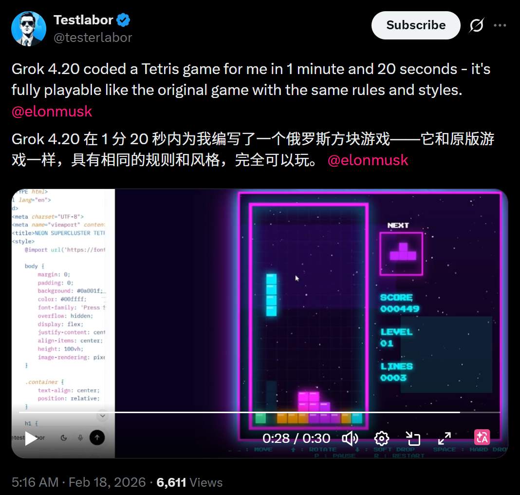 网友Testlabor用Grok 4.20在1分20秒内为编写了一个俄罗斯方块游戏。