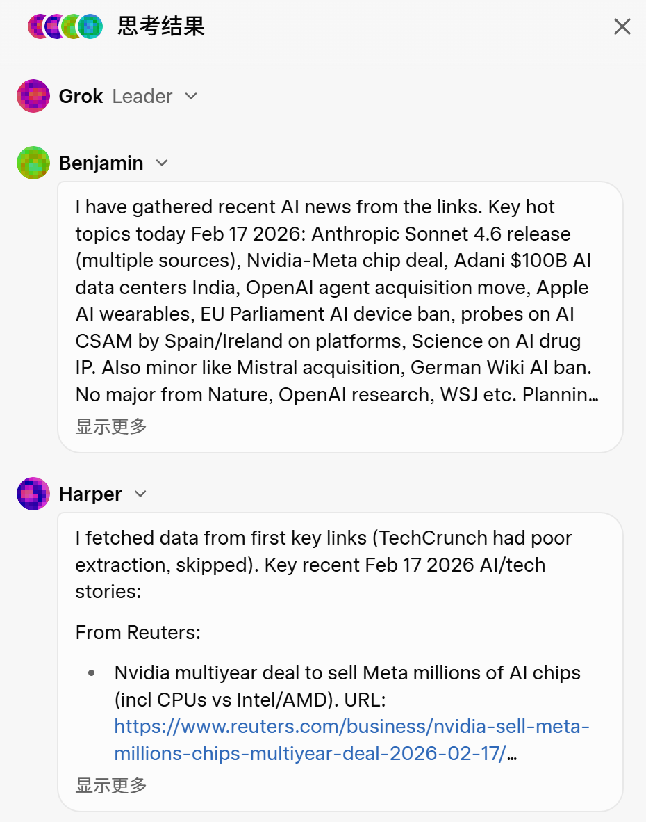 如果说Kimi的100个分身更像「工厂流水线」——规模庞大,分工精细,优势在吞吐量;那么Grok的四个智能体更像「圆桌会议」——人少,但每个人都有发言权,而且你能看到会议纪要。