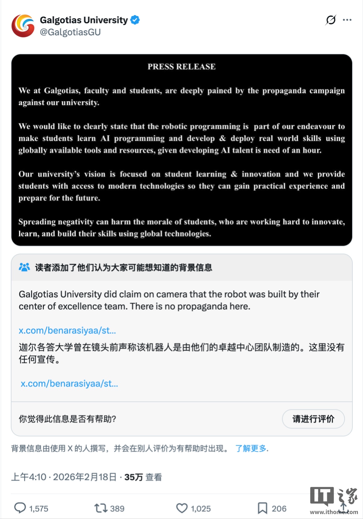 报道提到,当地时间 18 日(今天),校方承认这款机器狗确实是中国产品,但称未宣布过其为“自主研发”,只是购入作为教学工具。按照校方说法,这场风波缘于“沟通不畅”。