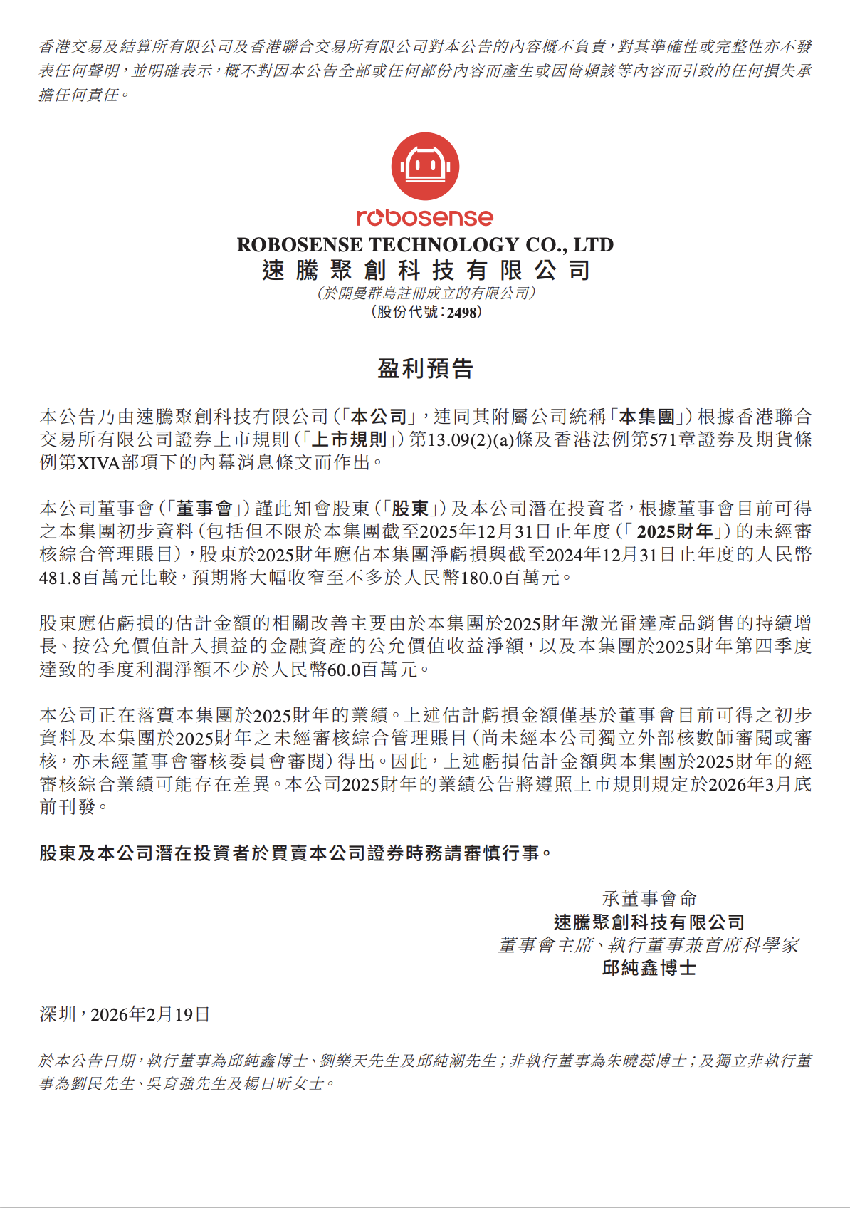 IT之家 2 月 19 日消息,今天晚间,速腾聚创发布盈利预告,预计 2025 年第四季度将首次实现单季度盈利,且盈利不少于人民币 6000 万元。