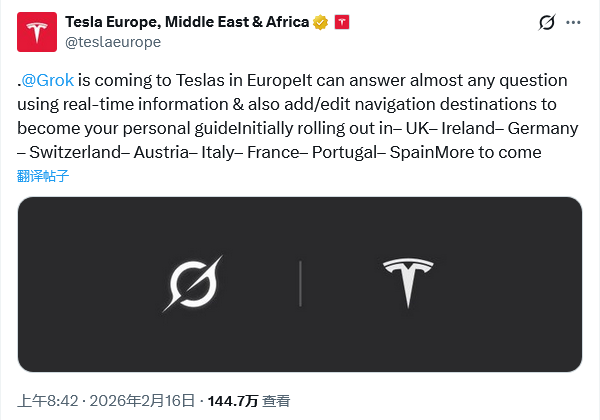 IT之家 2 月 19 日消息,特斯拉 EMEA 区域官方 X 账户本月 16 日表示,由其“同门”xAI 提供的 Grok 人工智能服务将登陆欧洲市场的特斯拉电动汽车,首批率先在英国、爱尔兰、德国、瑞士、奥地利、意大利、法国、葡萄牙、西班牙这 9 个国家推出。