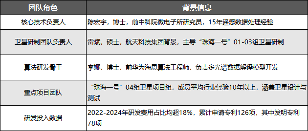 公司研发团队核心优势为“航天背景+跨领域技术融合+长期项目经验”,与商业遥感全链条布局战略高度适配,核心团队信息与研发投入如下: