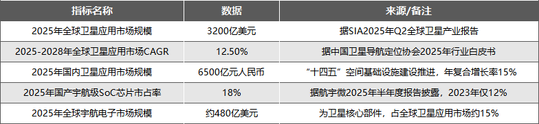 全球卫星应用市场已进入高速增长期,国内市场增速高于全球,公司核心产品宇航级SoC芯片国产替代空间较大,核心赛道数据如下: