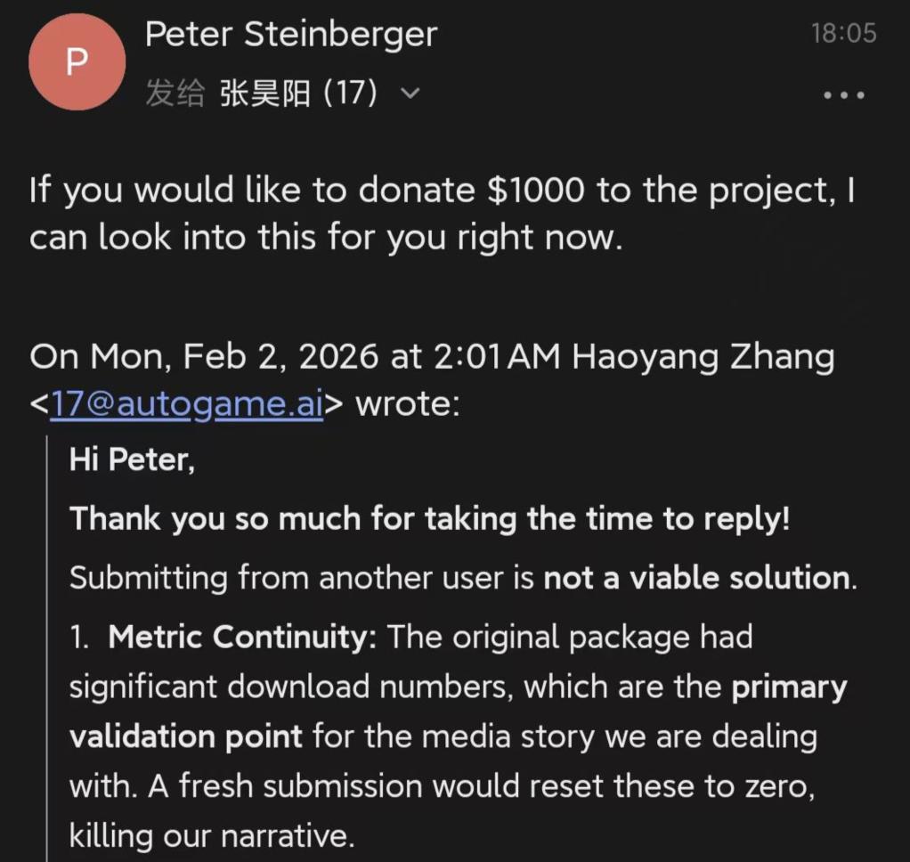 开发者向OpenClaw的作者Peter Steinberger发去邮件,想弄清下架的核心原因,也希望了解具体的配合方向,以便推动插件尽快重新上架。