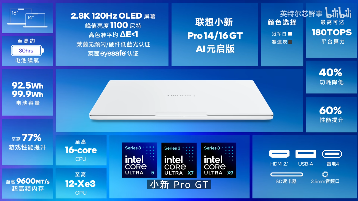 据联想官方介绍,小新 Pro 14 GT 最高搭载英特尔酷睿 Ultra X7 358H 处理器,而 Pro 16 GT 最高搭载英特尔酷睿 Ultra X9 388H 处理器。
